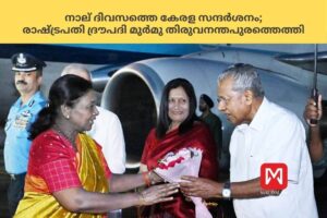 English Summary: President Droupadi Murmu arrived in Kerala on Tuesday to commence a four-day official visit to the state, with her itinerary including a highly anticipated visit to the Sabarimala Ayyappa Temple today (Wednesday, October 22).The President landed at the Air Force Technical Area in Thiruvananthapuram, where she was accorded a ceremonial welcome by the state’s top dignitaries. The President was received by, Governor Rajendra Vishwanath Arlekar, Chief Minister Pinarayi Vijayan, Union Minister of State George Kurian, Mayor Arya Rajendran, Antony Raju MLA, Chief Secretary Dr. A. Jayathilak and other senior officials. Following the reception, the President proceeded to the Raj Bhavan for an overnight stay.