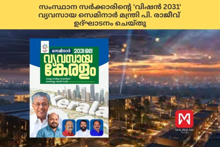 English Summary: The Vision 2031 Seminar, organized by Kerala’s Department of Industries and Commerce at Al Saj Convention Centre, Kazhakuttam, Thiruvananthapuram, aimed to shape a long-term industrial vision for the state as it approaches its 75th anniversary in 2031. The event was inaugurated by Minister P. Rajeeve and conducted in collaboration with KSIDC, K-BIP, and KINFRA. The discussions focused on strategies to ensure sustainable, high-value industrial growth with environmental responsibility and social equity. Policymakers, industry leaders, and institutional partners shared insights to help define Kerala’s future industrial framework.